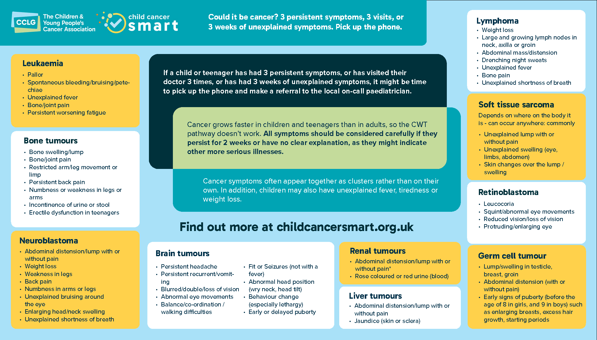 Childhood cancer grows much more quickly than adult cancers, and so if cancer is suspected, our guideline advises picking up the phone and discussing the case with your local on-call paediatrician. They will be able to advise where best to send the child or teenager depending on their story. This may well be in a rapid access clinic or similar, or straight to paediatrics the same day if there is strong suspicion.