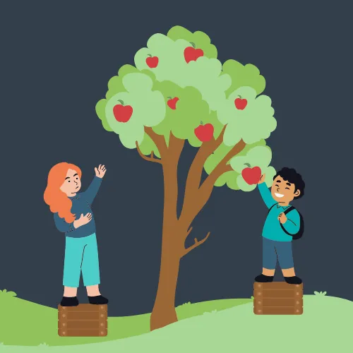 With equity, each child is given the right amount of boxes they need to be able to reach the apples. The girl is given three boxes and the boy is given one – they now can access the same number of apples and neither child is at a disadvantage.