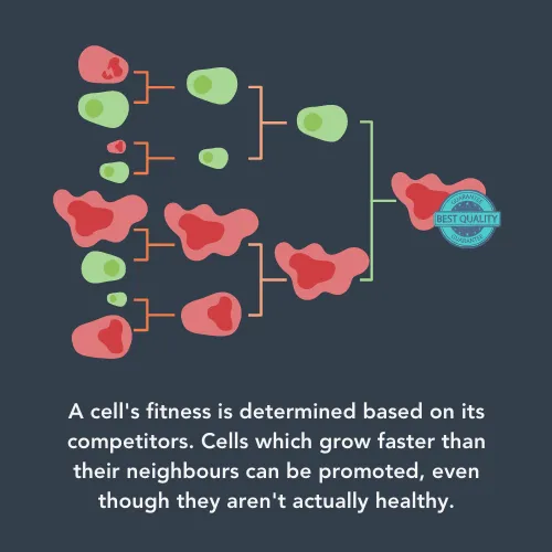 However, cells can only figure out fitness compared to other nearby cells – even an unfit cell, if surrounded by other unfit cells, would be allowed to survive. It’s also important to remember that our cells struggle to recognise cancer cells because they were once healthy cells. Therefore, they might just see a cell that is growing fast and reproducing quickly and class it as ‘super fit’.