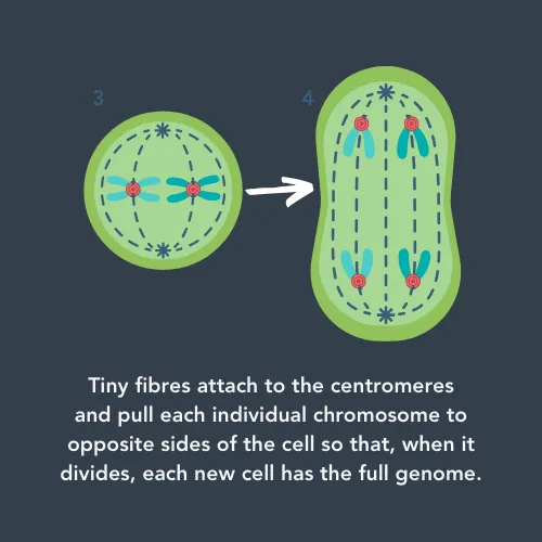 One of these repetitive regions of DNA is called the ‘centromere’. Whilst it doesn’t code for any proteins, it has a vital role in cell division. When cells divide into two new cells, they need to make sure each cell has a copy of the full genome. First, they copy all their DNA, and then wind it up into pairs of chromosomes for safekeeping. These pairs are connected by the centromere, which the cell grabs hold of and uses to pull half of each pair to opposite sides of the cell. This means that, when the cell is split across the middle, each new cell has all the chromosomes.