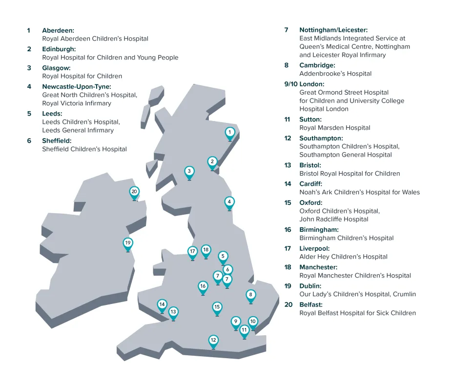 It also has links with hospitals around the country through its shared care programme. Often some of your child’s treatment can be given at a designated shared care centre in your local area. This set-up can help you and your family spend as much time as possible safely close to home.