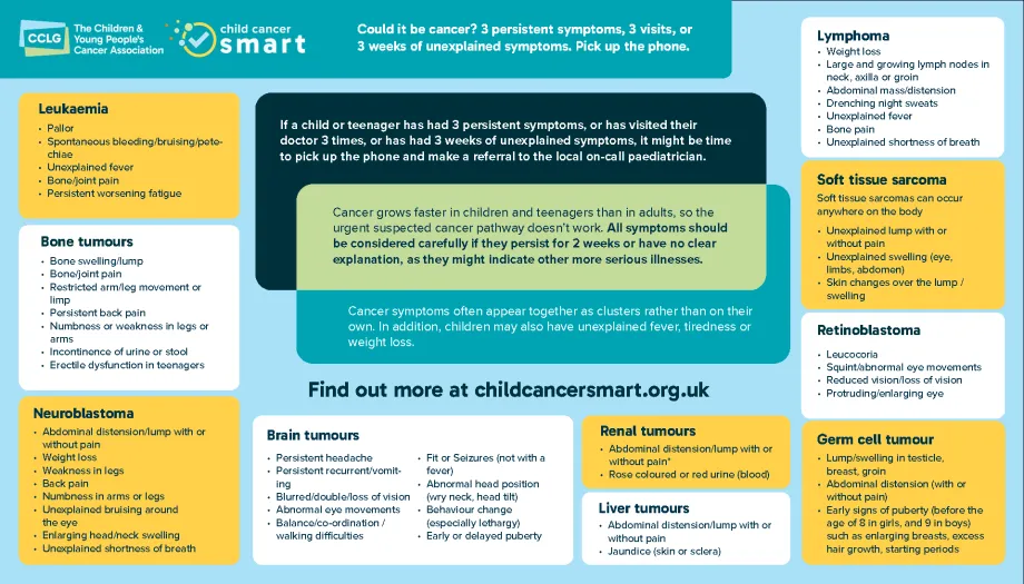Childhood cancer grows much more quickly than adult cancers, and so if cancer is suspected, our guideline advises picking up the phone and discussing the case with your local on-call paediatrician. They will be able to advise where best to send the child or teenager depending on their story. This may well be in a rapid access clinic or similar, or straight to paediatrics the same day if there is strong suspicion.