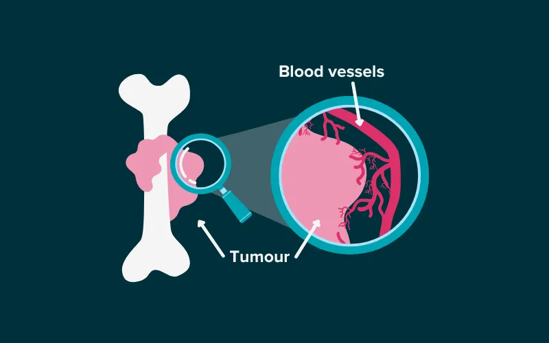 Blood vessels carry oxygen to the surface of the tumour, but struggle to get oxygen into the core of the tumour, creating low- and high-oxygen environments.