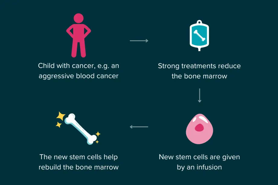 Bone marrow transplants, also known as haematopoietic stem cell transplants (HSCT), can be used to treat some childhood blood cancers. There are a few different types, depending on whether the stem cells being used have been donated from another person or from the patient, but they all follow roughly the same process.