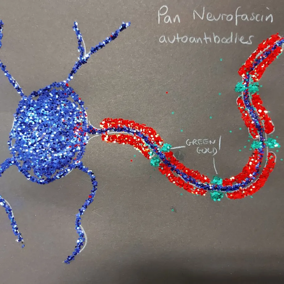 One of the nerve cell drawings with glitter to mimic antibodies.