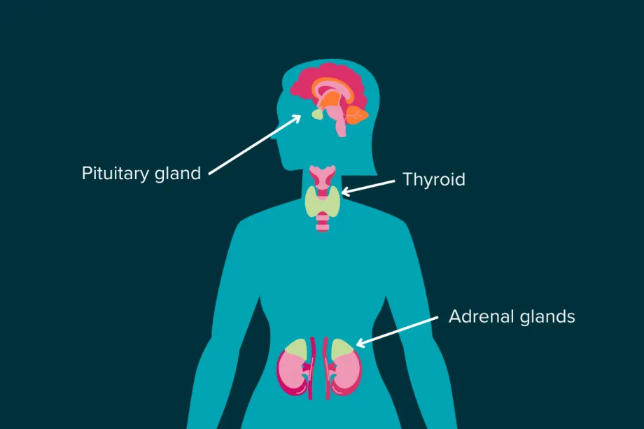 Cancer or its treatment can cause damage to glands in the endocrine system, which produces hormones that regulate many different processes in the body. This can be caused by cancer growing in or near the glands, or by surgery or radiotherapy near them. Sometimes, damage can take years to show any effects, such as to the pituitary gland in the brain.