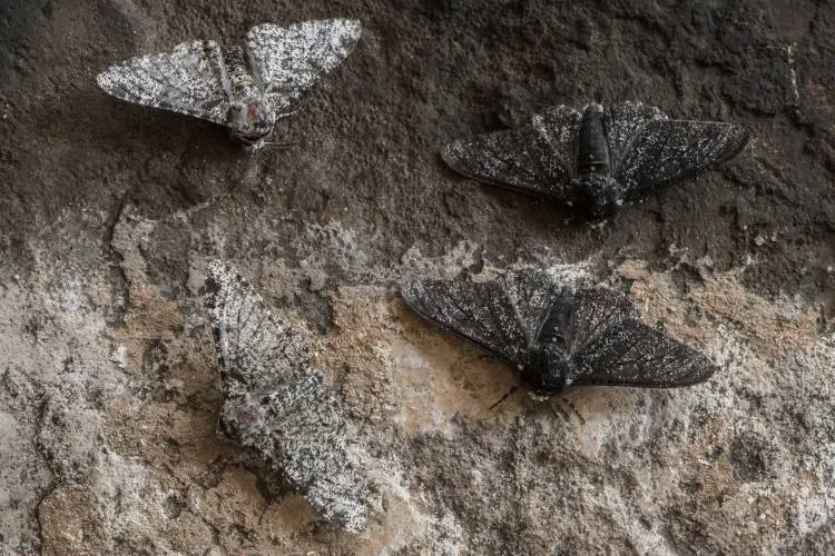 Can you see all four moths? Camouflage only works if you’re in the right environment. You can easily see the light moth on the dark background and vice versa. You can see why a dark moth would be more likely to survive and reproduce in a dark environment.