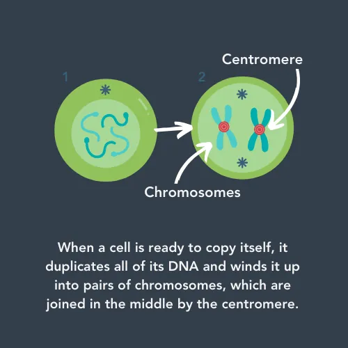 One of these repetitive regions of DNA is called the ‘centromere’. Whilst it doesn’t code for any proteins, it has a vital role in cell division. When cells divide into two new cells, they need to make sure each cell has a copy of the full genome. First, they copy all their DNA, and then wind it up into pairs of chromosomes for safekeeping. These pairs are connected by the centromere, which the cell grabs hold of and uses to pull half of each pair to opposite sides of the cell. This means that, when the cell is split across the middle, each new cell has all the chromosomes.